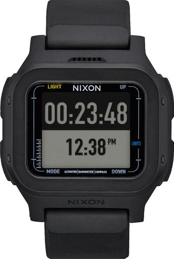 Be the know-it-all of the outdoor adventurers club with this expedition-style chronograph built to serve you the information you need and survive the elements. Durable, high-tech construction and no-nonsense readability keep you up-to-the-minute on the local conditions with a toolkit of functions including an altimeter, a barometer and a compass in addition to a light-up dial, alarm, dual time zones and your choice of 12- or 24-hour time readout.
