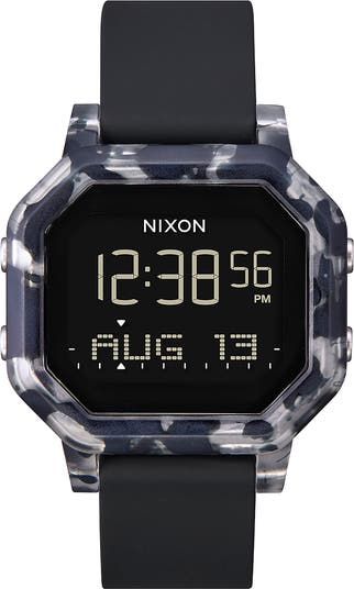 When the surf is up, you'll want to be there on time. This rounded-hexagon digital watch features an easy-to-read LCD dial with tide table and chronograph stopwatch functionalities, as well as multiple alarms and a calendar. The built-tough design has a water-resistance up to 100 meters for those who dive below the surface.