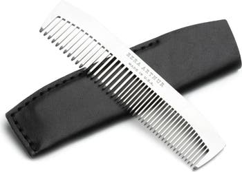 The No. 1827 Metal Pocket Comb is a classic pocket comb, made with the highest grade of 410 stainless steel offering both exceptional wear and corrosion resistance. The comb is prrecision machined and handcrafted, with 18 course teeth, 27 fine teeth and an ultra-smooth satin finish. Each comb is paired with a hand-stitched sleeve, made of Horween Chromexcel leather.