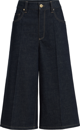 The pure cotton denim is characterized by a lightweight texture and a dark color that does not lighten after washing.