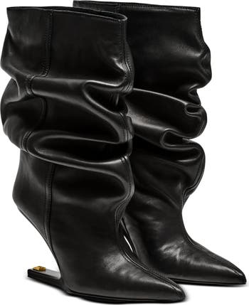 "No Wedge" smooth leather ankle boots Gaiter-style draping Pointed toe Engraved PB logo on the gold metallic detail decorating the inner heel Leather outsole, insole and lining Heel height: 9.5 cm Main material: 100% calfskin Made in Italy Item: GN0TA236LVIT