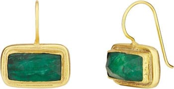 Bring gemstone vibes to your everyday styling with these emerald handmade earringngs. In a rectangle drop design, these gold plated earringngs feature Emerald gemstones within a textured gold mould. As seen on Netflix's Emily in Paris.