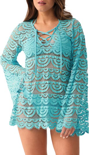 Look boho-chic from beach to street in this scalloped lace cover-up framed by flowy bell sleeves and lace-up ties.