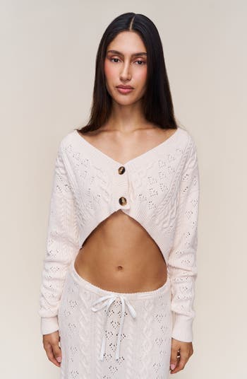 The Noah Wool Cable Crop Cardigan is spun from a soft knit with delicate cabling and pointelle stitches throughout. Its sharp V-neckline and cropped hem frame the body just right, finished with oversized buttons for a touch of undone polish.