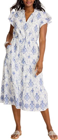 Breezy with a touch of sparkle, this midi dress is cut from cotton dobby woven with metallic threads and patterned in an elegant pineapple motif. Short sleeves and a split neckline with ties keep the look relaxed, while a drawstring waist defines the shape. A tiered skirt adds movement and easy volume for warm-weather days.