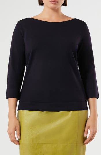 Ultrasoft virgin wool yarn brings an elevated look and feel to a sophisticated sweater framed by a boat neckline for modern appeal.