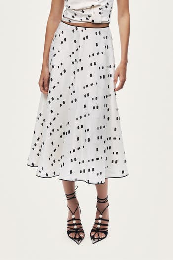Fluid midi skirt with an all-over abstract print. Clean waistline and soft drape for an effortless, modern silhouette.