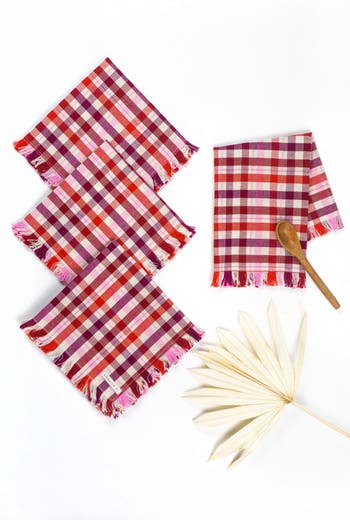 The Noel plaid party napkin is the perfect accent to add color and texture to any table setting. The party napkin is smaller in size than our dinner napkin and has a fringe around the edges. Stripes of red currant, cranberry and light pink are woven together to create this both seasonal and timeless piece. Ethically handwoven by artisans in Xela, Guatemala. Sold as a set of 4.