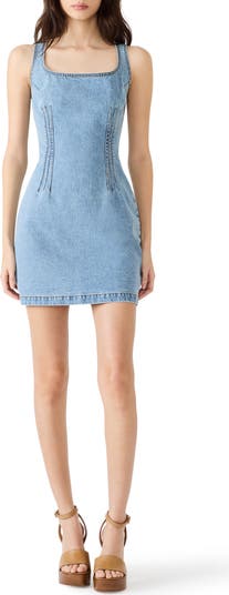 Vertical waistline seams shape the silhouette of this sleeveless stretch-denim dress cut in a leggy length.