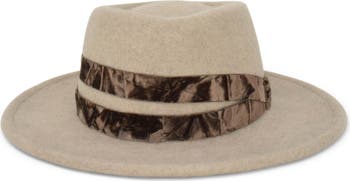 Shaped with meticulous care in the USA, this wool-blend hat is cinched by a crushed-velvet band whose rippled texture brings depth, dimension and a hint of decadence. The finish reads luxurious in daylight then turns moody after dark for a quiet yet commanding punctuation.