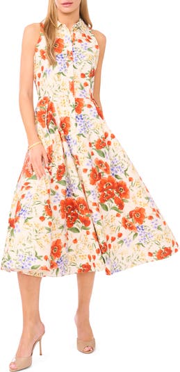 A sleeveless silhouette keeps you feeling breezy in this all-cotton shirtdress made with buttons down the front and pleats at the waist, giving bold flare to the skirt.