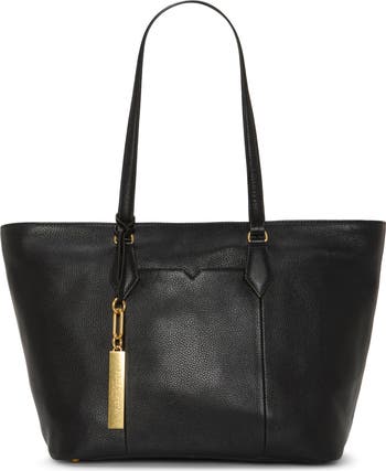 Aged-finish hardware highlights the textured leather exterior on a structured tote featuring ample storage compartments and suspended from a pair of slender shoulder straps.