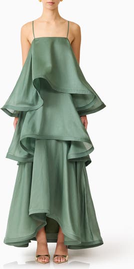 The cascading flared tiers of pink voile evoke the unfurling petals of a flower in this captivating maxi dress that flows with fluttery movement.