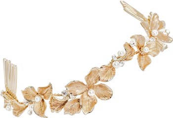 Hand-painted flowers, marquise-cut Czech crystals and imitation pearls adorn this stunning halo comb that adds illumination to your beautiful tresses. A wire design creates flexibility and versatility and features secure one-inch combs on either side, so you can wear it on the top of your head, on the side or on the back of a classic updo.