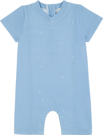 - Snap button closure at the crotch/inner legs