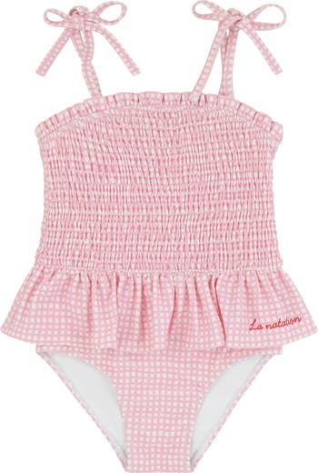 Lightweight and flexible, this gingham bathing suit is designed for comfort and movement, featuring a smocked body and peplum ruffle for a stylish look.