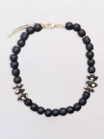 The NOIR necklace is bold, minimal, and effortlessly cool. Hand-strung with matte black beads and accented by sculptural polka-dot discs and gold details, it’s finished with a sleek gold-plated clasp. Designed to make a quiet statement, this piece pairs just as easily with a white tee as it does with an evening look.