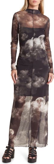 A cloudy pattern invokes feelings of watching the night sky as you step out in this long-sleeve mesh dress.