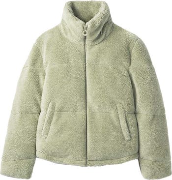 A soft faux shearling coat features a stand collar and is perfect for layering.