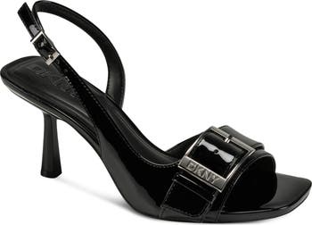Gleaming buckle hardware accents the vamp of this slingback slide sandal set on a tapered heel for modern balance.