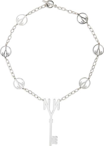 Stations of brand-themed peach signs and and a polished key pendant create an eye-catching necklace that emboldens both day and evening looks.