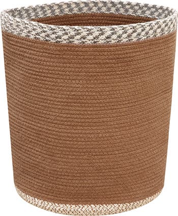 Cotton basket made of braided cotton cords in Taupe color and contrasted rows of mixed natural and marsala color cords at the top edge.