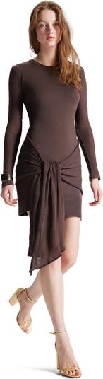 This bodycon knit dress features sheer long sleeves and a sculptural front drape for asymmetrical style. A sleek and modern knit dress perfect for evenings, events, or elevated date night outfits.