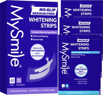 - NO SLIP & NO RESIDUE TEETH WHITENER: These teeth whitening strips are designed with a non-slip adhesive to ensure a secure fit on your teeth, providing an effective whitening experience without worrying about them slipping off. Residue-Free MySmile teeth whitener strips do not leave any residue or debris on your teeth when you remove them.