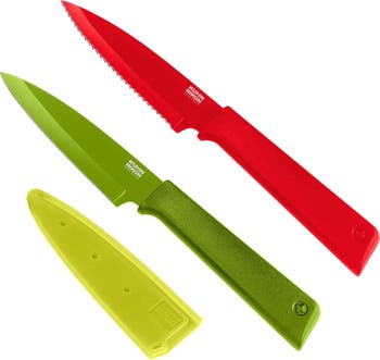 Discover the precision and efficiency of the Kuhn Rikon COLORI+ Non-Stick Paring Knives. This set of 2 features both straight and serrated blades, expertly designed for versatile cutting tasks. Crafted with high-quality non-stick coating, these knives glide effortlessly through fruits, vegetables, and more. The vibrant red and green colors add a splash of style to any kitchen, while the accompanying safety sheaths ensure secure storage. Whether you're dicing, slicing, or peeling, the Kuhn Rikon COLORI+ collection is your reliable kitchen companion.