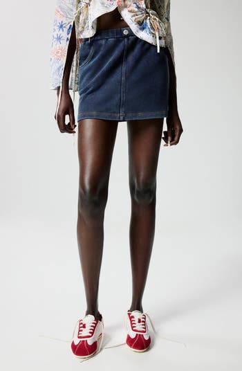 An elastic waistband enhances the ease of this nonstretch denim skirt cut in a leggy length.