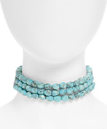 Organic style inspires this captivating choker necklace comprised of three rows of faux-turquoise beads.