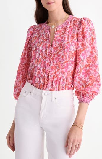 Crisp pintucks texture this blousy printed top cut from a soft cotton-modal blend and finished with a flouncy peplum.
