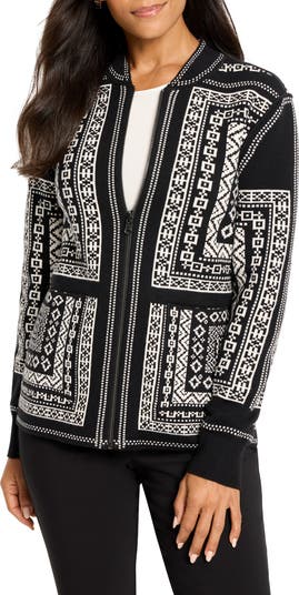 Bold geometric patterns take center stage on this reversible knit jacket that offers two stunning styling options in one.