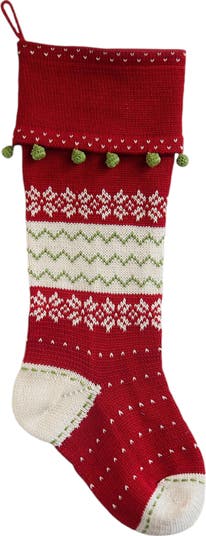 This stocking features a classic red knit accented with intricate snowflake patterns in ivory and zigzag detailing in a soft green. The cuff is adorned with playful green pom-poms, adding a touch of fun to its classic design. Perfect for hanging by the fireplace, this stocking is as functional as it is decorative, offering plenty of room for treats, small gifts, and holiday surprises. The durable cotton weave ensures that this stocking will become a cherished part of your holiday traditions for years to come.
