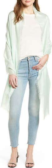 Delicate eyelash fringe frames an airy, ethereal scarf woven from soft silk and cashmere.