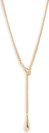 A polished teardrop brings focal shine to an elegant lariat necklace composed of gleaming curb-chain links.