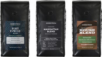 Enjoy the coffee from Nordstrom eBar in your own home with a trio of medium and dark roasts ethically sourced from the world's premier coffee-growing regions. These whole-bean blends can each be used to make brewed coffee, cold brew or espresso.