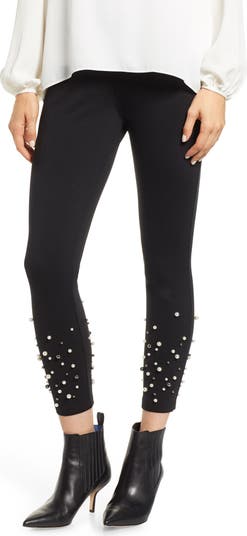 Mixed-finish imitation pearls stud stretchy ponte leggings, adding a fanciful touch to an essential look.