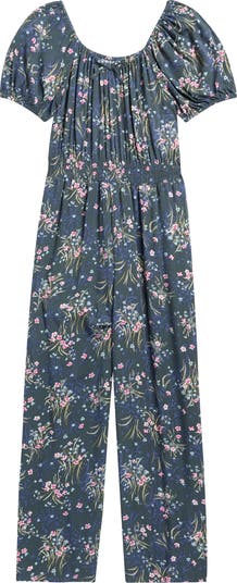 This lightweight jumpsuit illustrated in beautiful wildflowers is finished with a smocked neck, cap sleeves and wide, flowy legs.