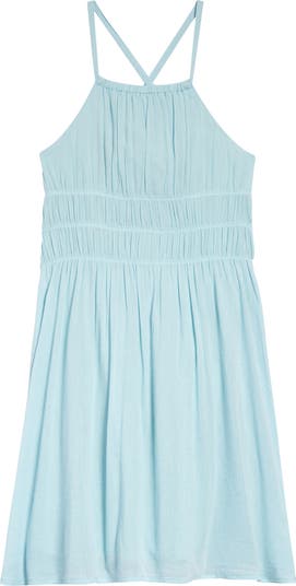 Smocked panels detail the bodice of a sweet sundress with a halter neck and slim straps that cross at the back.