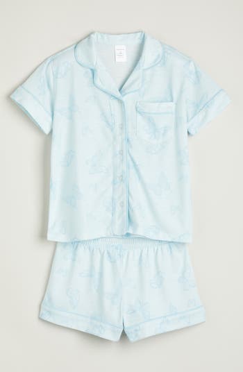 A playful print accented with tonal piping patterns these kid-size pajamas with a button-up top and matching shorts.