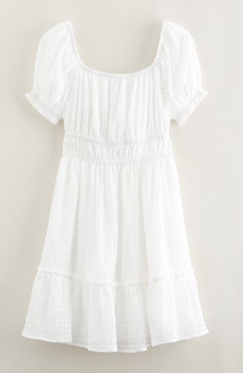 A bow and cutout at the back add to the sweet appeal of a puckery seersucker dress that's shaped by shirring and volumized with a flouncy tier.