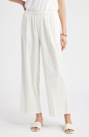 A breezy linen blend lends warm-weather charm to wide-leg pants fashioned with a slim fit and ankle-grazing hems.