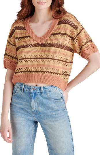 An airy mix of stitches graces each colorful stripe of this cute cotton sweater made even more season spanning with its short-sleeve silhouette.