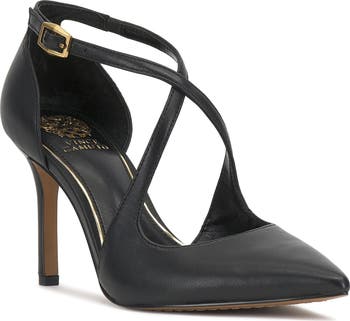 Slim, crisscrossing straps and a pointy toe bring crisp angles and dimension to a striking leather pump lofted by a stiletto heel and secured with an adjustable buckle closure.