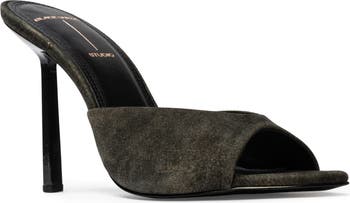 A towering heel gives statement-making height to an event-ready sandal with a dramatically curved vamp.