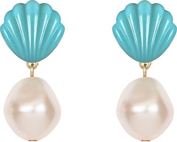 Evoke the beauty of the sea with these enchanting earrings brightened by hand-carved turquoise shells above baroque faux-pearl drops. Handcrafted in New York, each pair is unique due to the natural materials used.
