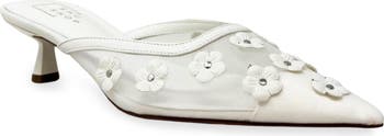 Floral appliqués scatter the mesh upper of this pointy-toe mule adding to its whimsical style.