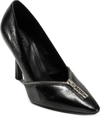 Zippered logo hardware creates an edgy aesthetic at the topline of a pointy-toe pump featuring a textured faux-leather upper and svelte stiletto heel.