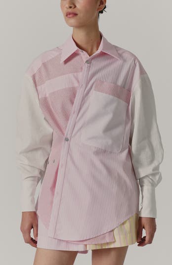 A classic button-up gets a modern refresh with subtle mixed stripes and softly contrasted sleeves. Tailored through the shoulders with an easy, elongated fit, this long-sleeve blouse blends crisp structure and feminine softness for effortless, everyday polish.